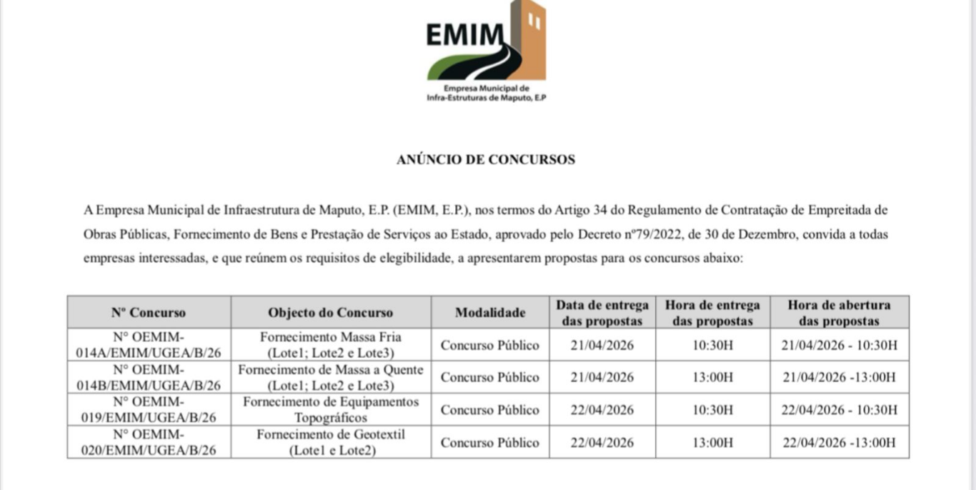 A Empresa Municipal de Infraestrutura de Maputo, E.P., nos termos do Artigo 34 do Regulamento de Contratação de Empreitada de Obras Públicas, Fornecimento de Bens e Prestação de Serviços ao Estado (Decreto nº 79/2022, de 30 de Dezembro), convida todas as empresas elegíveis a apresentarem propostas para os concursos disponíveis.